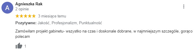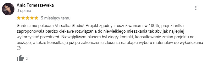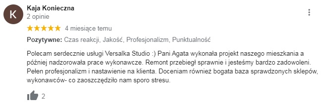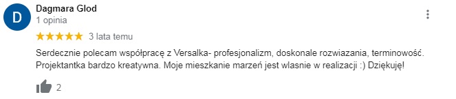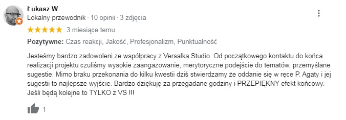 Opinie są w naszej ocenie fundamentem każdej dynamicznie działającej firmy. Bardzo często uzyskujecie Państwo kontakt do "Versalki" z polecenia, a to za sprawą tego, że każde z naszych zleceń dopinamy-od pierwszego maila, do pierwszej kawy w Państwa nowym wnętrzu.